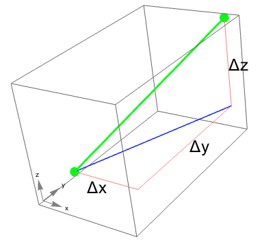 - The green line is our distance, and is the hypotenuse of the right triangle with legs of $\Delta z$ and the blue line.