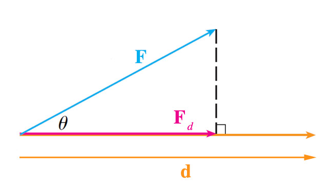 Work is the product of the displacement and the component of the force along the direction of the displacement. $$\nonumber \text{Work}=F_d d = (F \cos \theta) d=Fd\cos\theta.$$We shall see shortly that this can be written as $$\text{Work}=\myv F \cdot \myv d.$$ [Units: Newton-meter = Joule]
