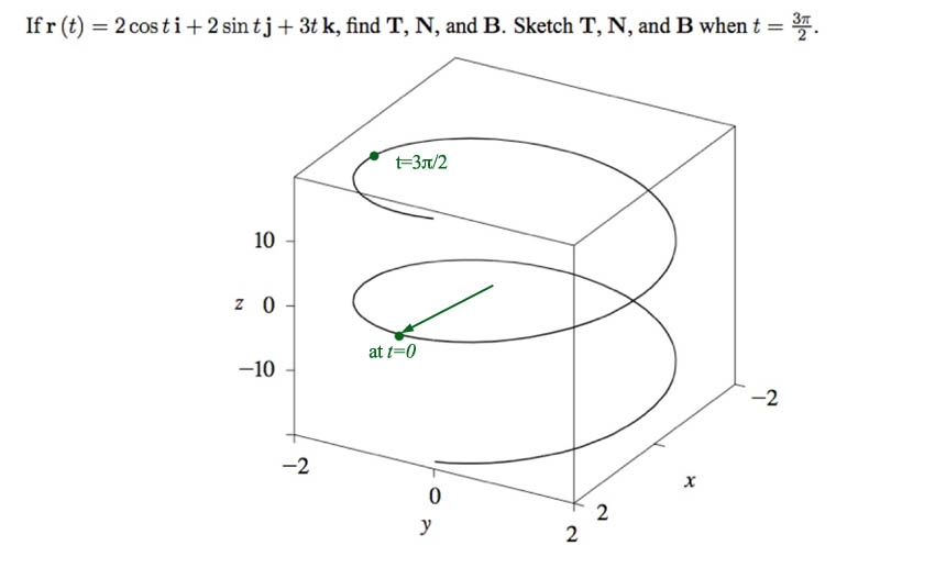For $\myv r(t)=2\cos t \uv i + 2\sin t \uv j + 3t \uv k$: Find $\uv T$, $\uv N$, and $\uv B$ at $t=3\pi/2$. Sketch these on a plot of $\myv r(t)$.