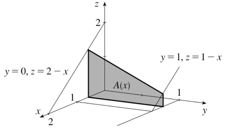 Holding $x=1$, and integrating the trace $f(1,y)$ gives us the area of the cross-section shown, $A(x=1)$.