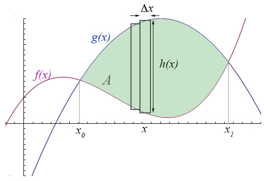 Then, the area, $A$, between the curves is $$\begineq A&=\int_{x_0}^{x_1}h(x)\,dx=\int_{x_0}^{x_1}\left(\int_{y=f(x)}^{g(x)}dy\right)\,dx\\ &=\int_{x_0}^{x_1}\int_{f(x)}^{g(x)}dy\,dx\equiv \iint_A dA \endeq$$ where $dA=dx\,dy$ is a small chunk of area, integrated over the region, $A$, shown.