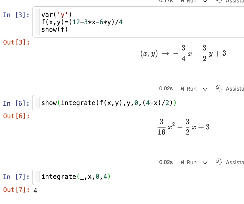 Finally, to get the upper limit on the $y$ integral, we want to integrate from some point in the $x-z$ plane "up" to the our plane, written as a function $y(x,z)$. Solve our original function for the plane, $z=\frac14(12-3x-6y)$ for $y$, we find that the upper limit is $y(x,z)=\color{blue}\frac16(12-3x-4z)$. Putting these all together: $$\color{blue}V=\int_{z=0}^3\int_{x=0}^{4-\frac43z}\int_{y=0}^{\frac16(12-3x-4z)}\,dy\,dx\,dz$$