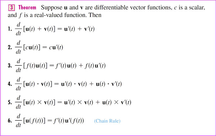 A theorem: if $\myv r(t)=\langle f(t),g(t),h(t)\rangle = f(t)\uv i+g(t)\uv j+h(t) \uv k$, where $f$, $g$, and $h$ are differentiable functions, then $$\myv r'(t)=\langle f'(t),g'(t),h'(t)\rangle = f'(t)\uv i+g'(t)\uv j+ h'(t)\uv k.$$